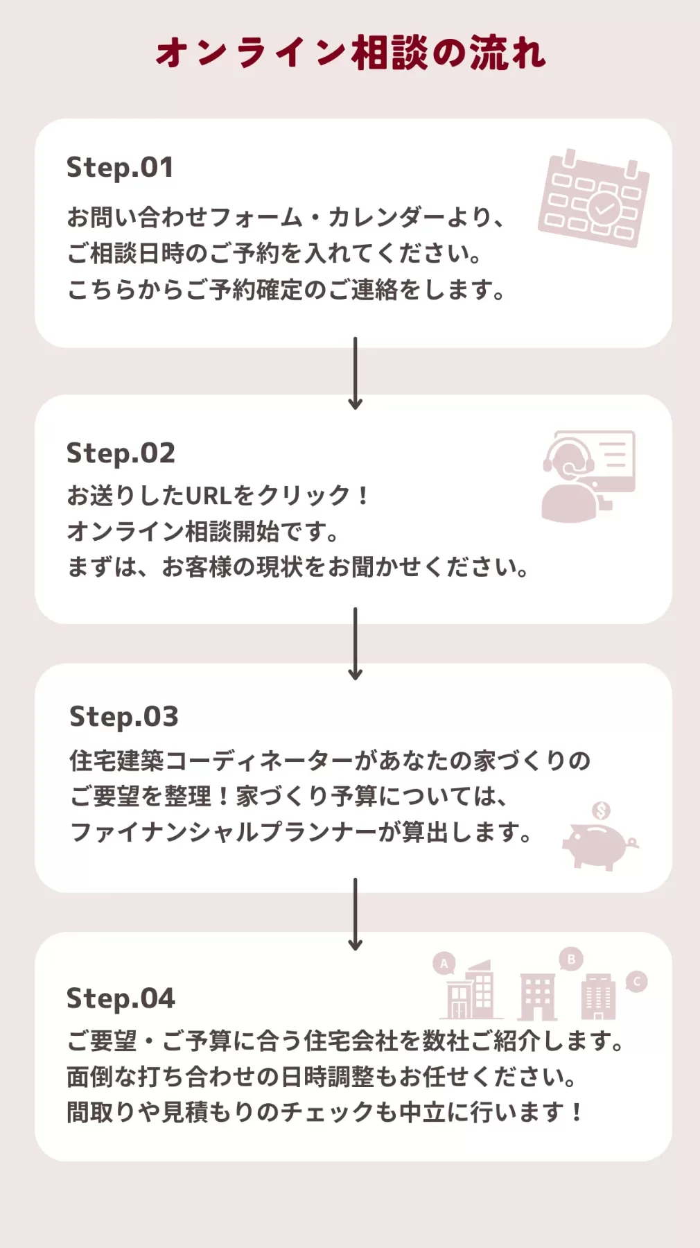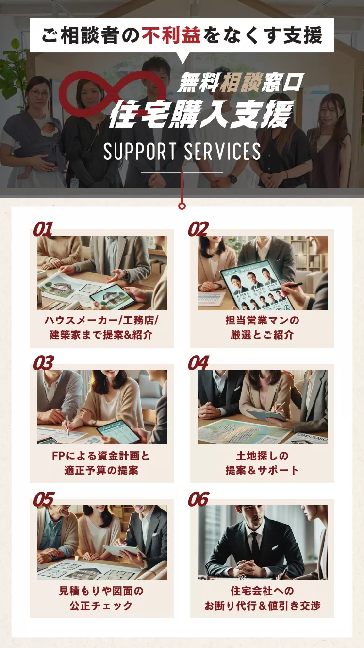 いいえ、工務店、建築家、ハウスメーカーをご紹介可能です。 また注文住宅だけでなく、建売、中古戸建、マンション、リフォームなどのご相談もOK! 家づくりのことならなんでもご相談ください。またご紹介後も図面や見積書のチェックなど気になることはなんでもご相談していただけます。