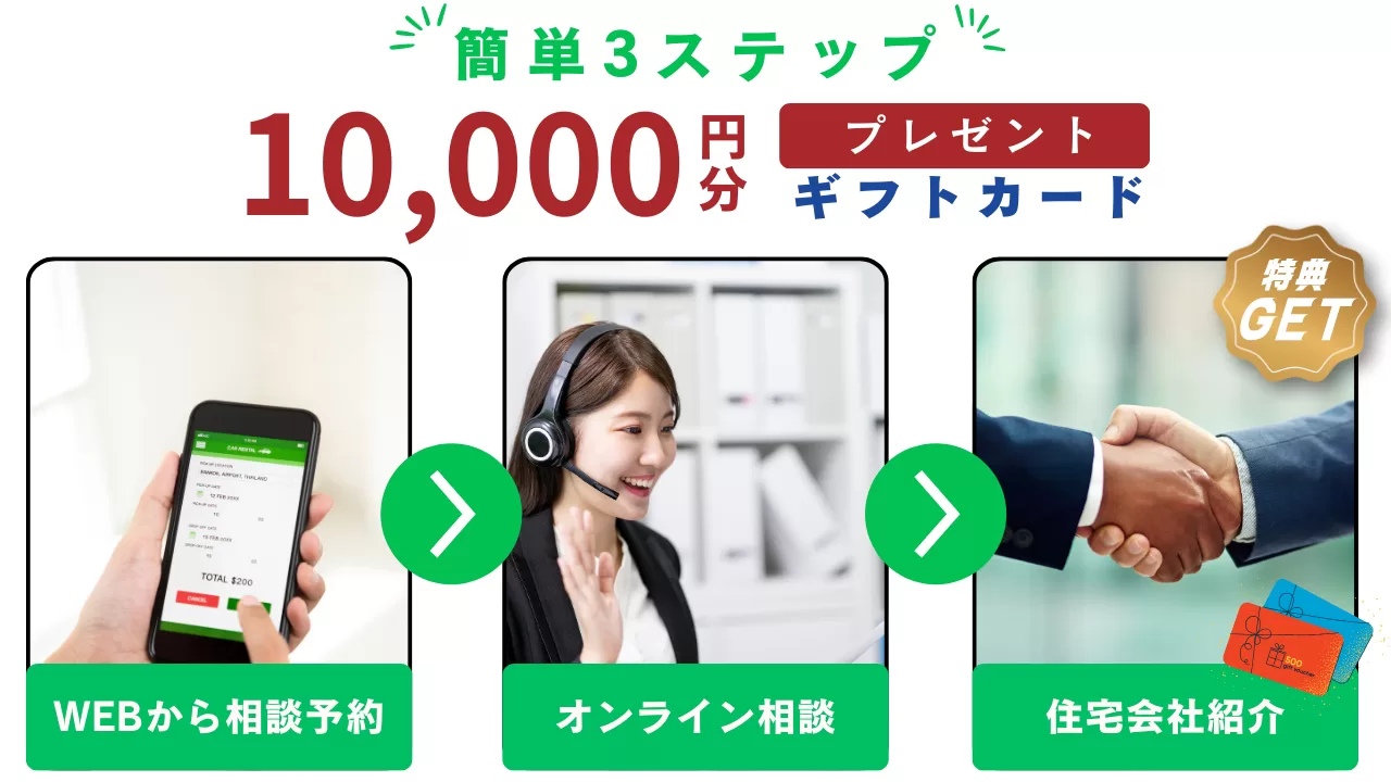 ※ 最大10,000円分の特典は、弊社がオンライン相談予約から紹介した建築会社に商談された方が対象となります。デジタルギフト券「デジコ」を使って送付いたします。特典送付まで最長1ヶ月ほどお時間を頂く場合がございます。また毎月10名様限定となります。デジタルギフト「デジコ」についてhttps://user.digi-co.net/use
