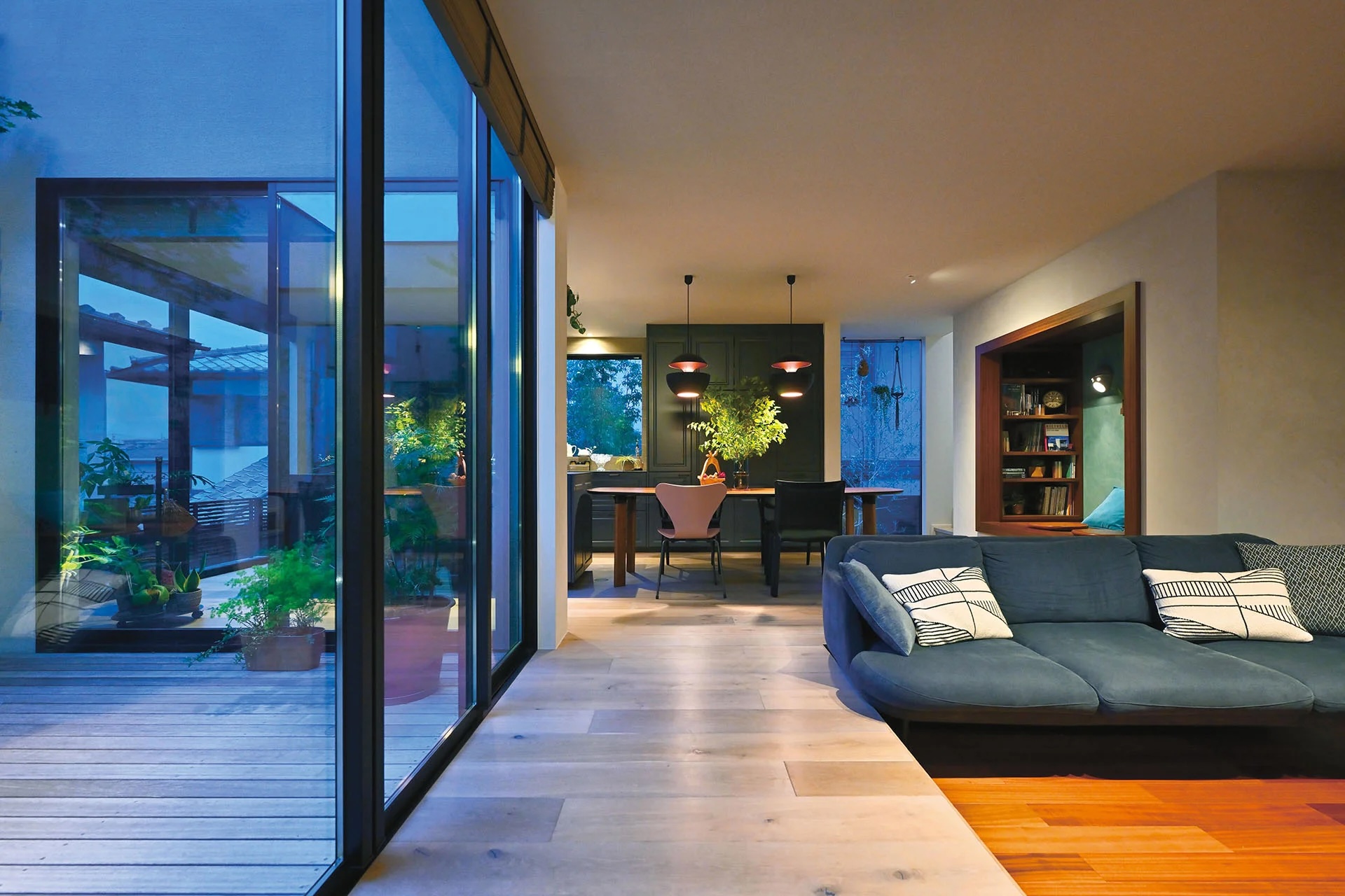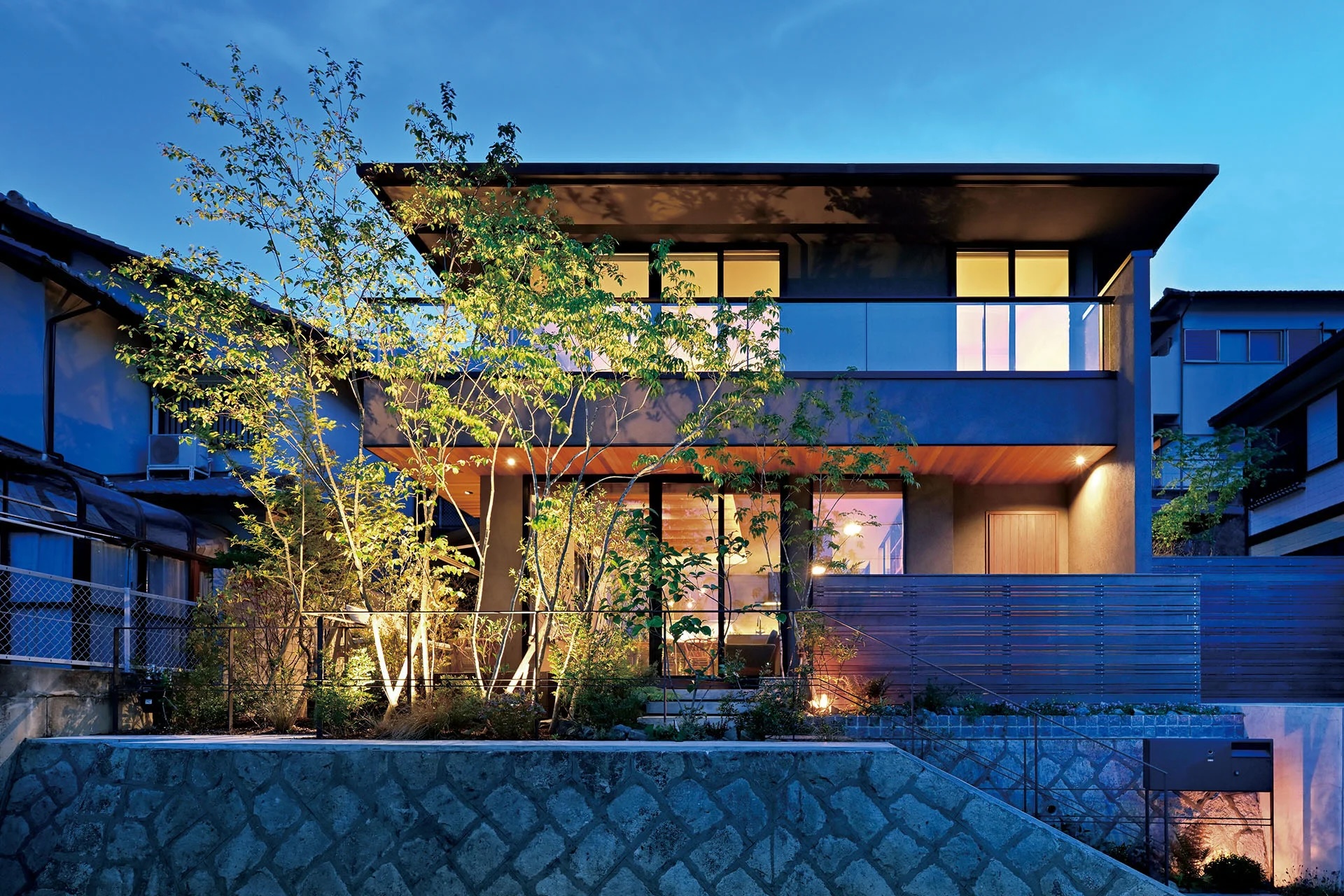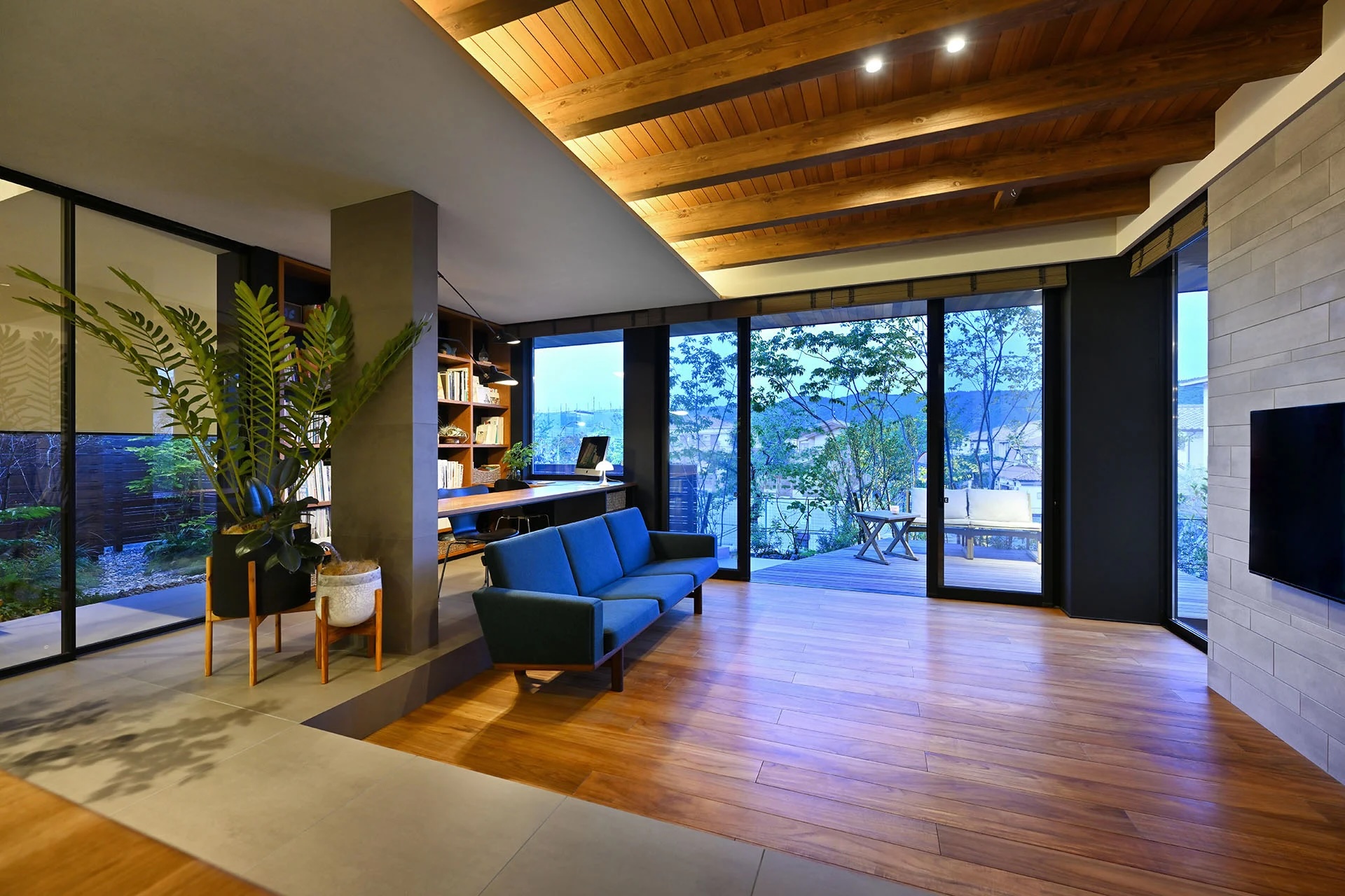 公園の緑に臨む、3つの庭のある家